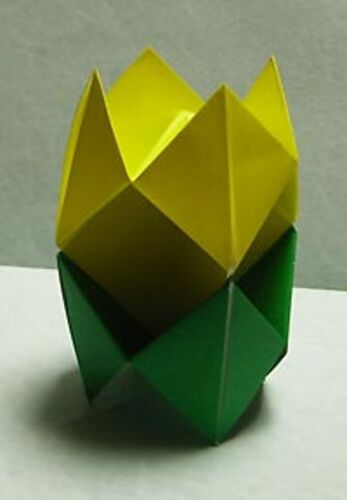 サンタと一緒に飾れるようなツリーを作ってみた。が、すごいシンプルなので(テーブルの基本形からちょこっと折ったパーツを重ねただけ)、すでに誰かが発表してそうでもあり。詳しい方に情報求む。幹は『折り紙夢WORLD』で紹介されてた鶴の基本形から作るの…